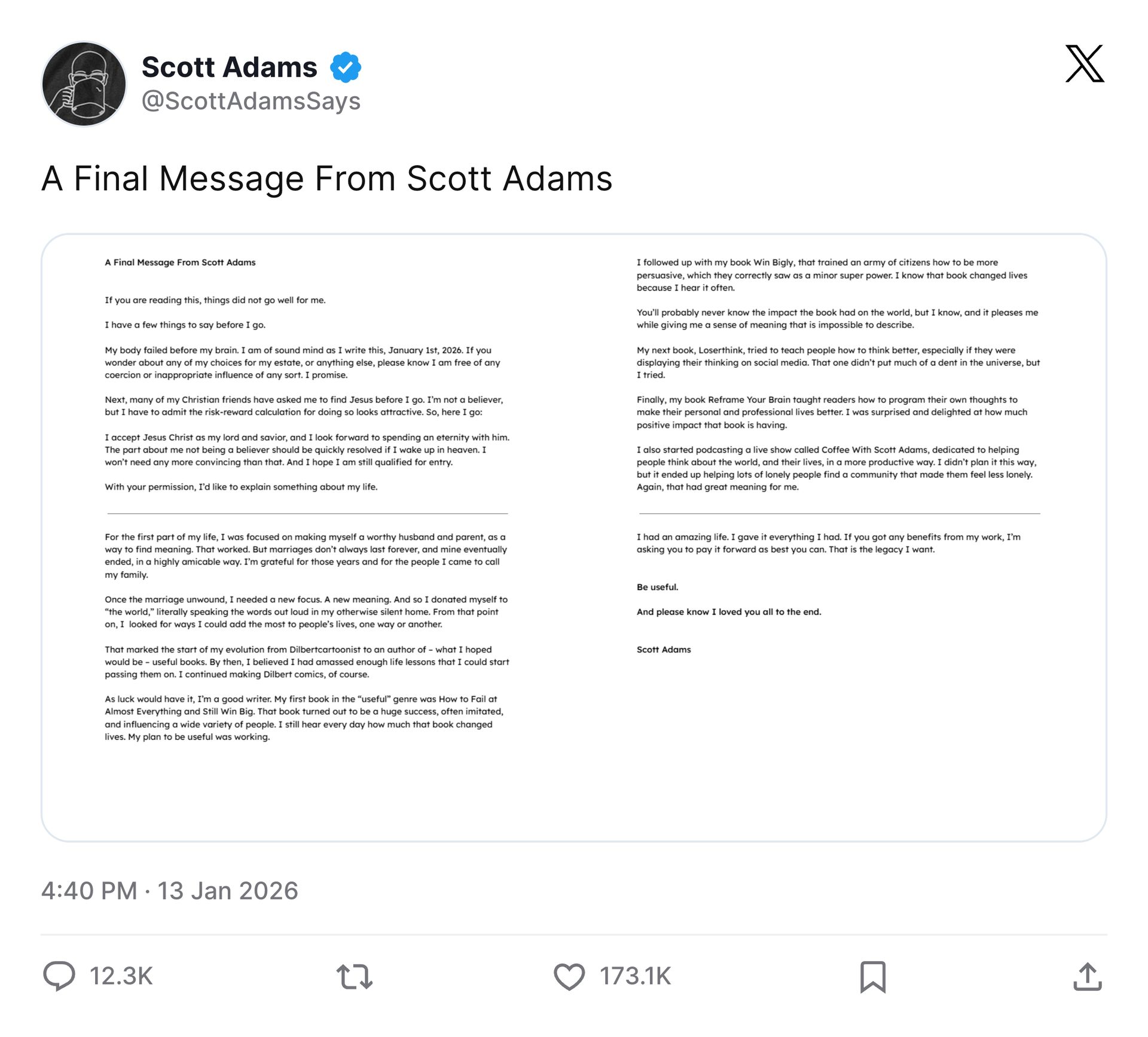 Yesterday, we said goodbye to the creator of Dilbert, a great author, and a remarkable human being — Scott Adams. Your voice will be deeply missed. Rest in peace, sir 🫡